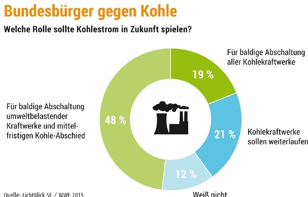 Bundesbürger gegen Kohle. Die Mehrheit der Deutschen lehnt den klimaschädlichsten Energieträger ab. Dies geht aus einer repräsentativen YouGov-Umfrage im Auftrag der Energiewende-Partner WWF und LichtBlick hervor. (Quellenangabe: "obs/LichtBlick/WWF")