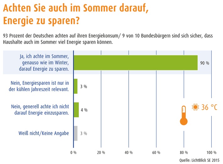 Hamburg (ots) - 93 Prozent der Deutschen achten auf ihren Energiekonsum. Neun von zehn Bundesbürgern sind zudem der Auffassung, dass Haushalte auch im Sommer viel Energie sparen können. Nur drei Prozent meinen, dass sich der Energiekonsum nur im Winter reduzieren lasse. Zu diesem Ergebnis kommt die repräsentative YouGov-Umfrage zum Thema "Energiesparen im Sommer" unter 1000 Bundesbürgern im Auftrag des IT- und Energieunternehmens LichtBlick.