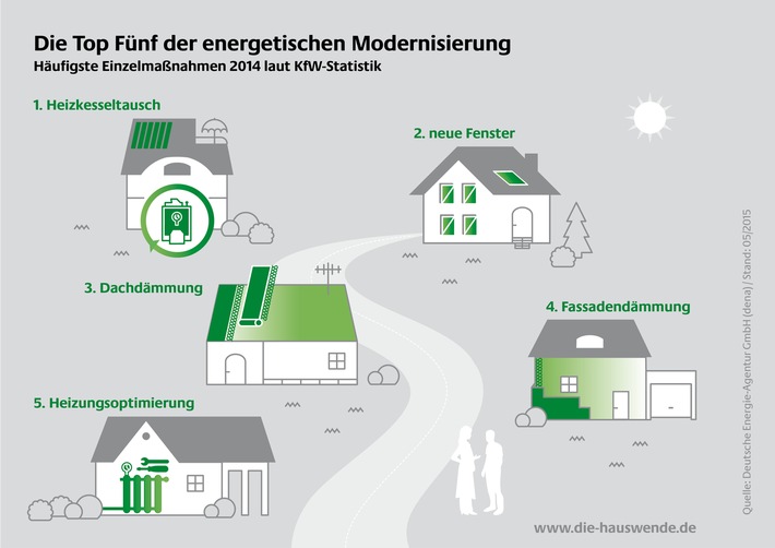 Berlin (ots) - Schritt für Schritt statt alles auf einmal: Um die eigenen vier Wände energieeffizient zu modernisieren, nimmt die Mehrzahl der Hausbesitzer in Deutschland nicht gleich eine Komplettsanierung in Angriff, sondern setzt auf sogenannte Einzelmaßnahmen. Der Austausch alter Heizkessel lag dabei im vergangenen Jahr an der Spitze der fünf häufigsten Modernisierungsmaßnahmen zur Senkung der Heizkosten, wie eine Auswertung der Förderstatistik der staatlichen KfW-Bank durch die Deutsche Energie-Agentur (dena) zeigt. Neue Brennwertkessel, Wärmepumpen, Solarthermieanlagen, Pelletheizungen oder andere effiziente Heiztechnik wurden 2014 rund 56.500 Mal von der KfW gefördert. Der Heizungstausch war damit die am häufigsten unterstützte Einzelmaßnahme.