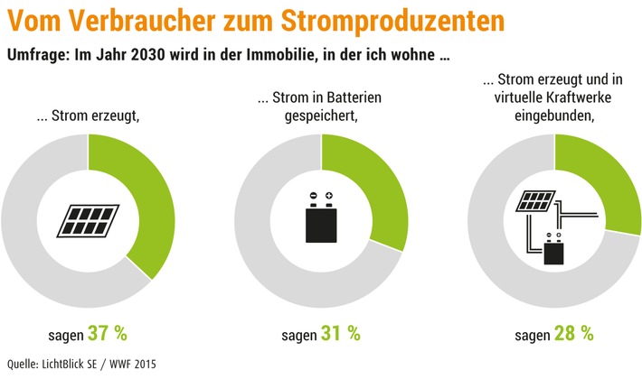 Berlin (ots) - Deutschlands Bürger haben die Energiewende in ihre Zukunftsplanung integriert. Mehr als jeder Dritte (37 Prozent) hält es für wahrscheinlich, dass im Jahr 2030 in der Immobilie, in der er wohnt, ein Teil des benötigten Stromes selbst erzeugt wird. Fast genauso viele (31 Prozent) glauben, dass der vor Ort erzeugte Strom dann in einer Batterie gespeichert wird. 28 Prozent können sich sogar vorstellen, dass dieser Strom im Rahmen eines virtuellen Kraftwerks gehandelt werden könnte.