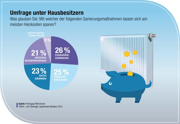Krefeld (ots) - Rund 50 Prozent der deutschen Hausbesitzer halten Wärmedämmung für die sinnvollste Modernisierungsmaßnahme, um Heizkosten zu sparen. Das ergab eine Umfrage von TNS Emnid im Auftrag von Primagas. Doch die Fassadendämmung gerät immer stärker in die Kritik: Sie sei teuer, werte Immobilien optisch ab, und die Investition rechne sich nicht, so die Experten.