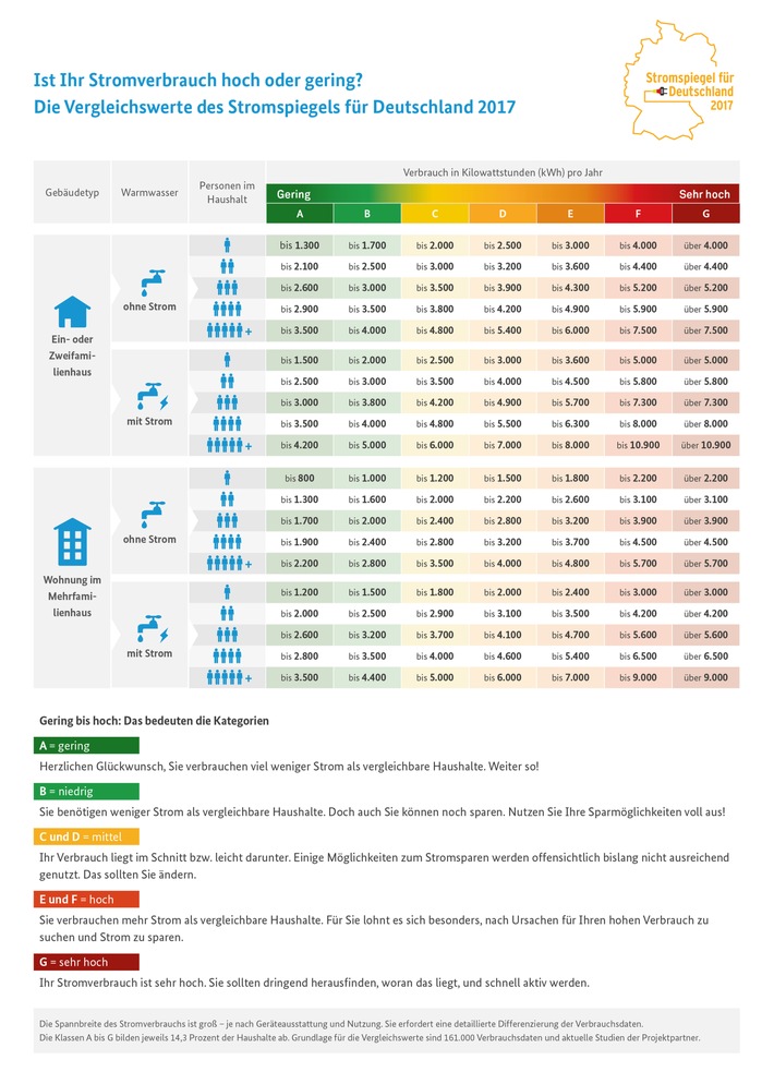 Verbrauchen Sie mehr Strom als ähnliche Haushalte? / Dreipersonenhaushalt kann jährlich bis zu 260 Euro sparen / 161.000 Verbrauchsdaten ausgewertet / Stromspiegel für Deutschland 2017: die Vergleichswerte als druckfähige Tabelle.