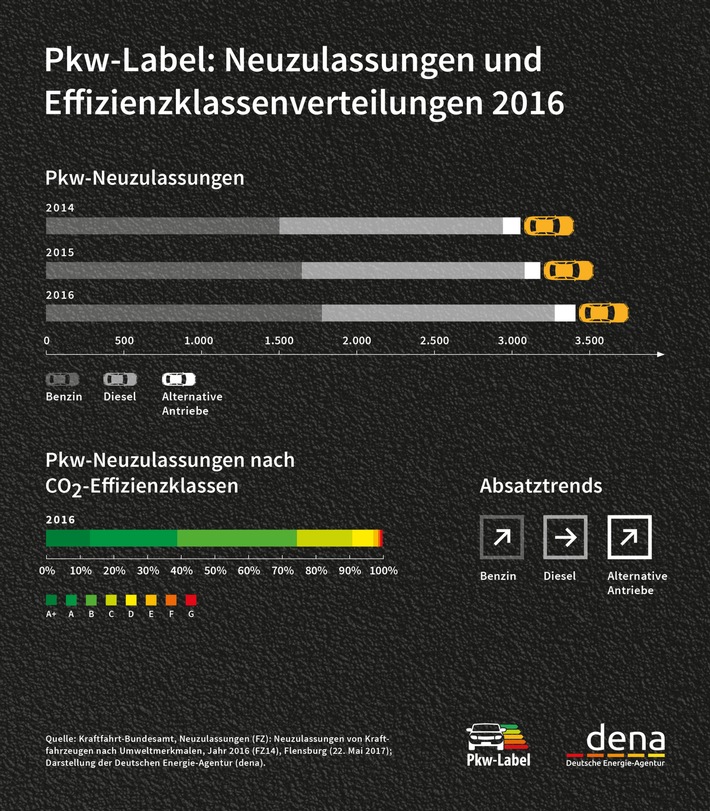 Die Deutschen kaufen immer mehr Neuwagen. Drei Viertel der 3,3 Millionen Neuzulassungen im Jahr 2016 haben eine der grünen Effizienzklassen A+, A oder B, in der oberen Mittelklasse sind es 95 Prozent. Der Anteil alternativer Antriebe ist nur geringfügig gestiegen (von 1,7 auf 2 Prozent). Auch die CO2-Reduktionen der Gesamtflotte um ein Prozent gegenüber dem Vorjahr bleiben hinter den Erwartungen zurück. Dies sind die zentralen Ergebnisse des jährlich erscheinenden Monitoring-Berichts über Pkw-Neuzulassungen der Deutschen Energie-Agentur (dena).