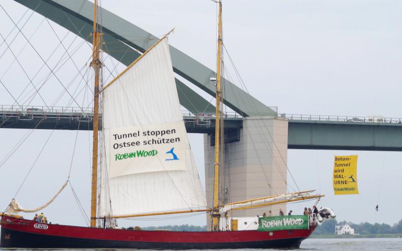 Aus Protest gegen die geplante Untertunnelung des Fehmarnbelts in der Ostsee haben sich ROBIN WOOD-AktivistInnen heute Vormittag von der Fehmarnsundbrücke zwischen dem schleswig-holsteinischen Festland und der Insel Fehmarn abgeseilt. Sie spannten dort ein Transparent mit der Aufschrift „Beton-Tunnel wird WAL-URNE“. Begleitet wird die Aktion vom Traditionssegler LOVIS, der ein Banner mit dem Slogan „Tunnel stoppen – Ostsee schützen“ hisste. Auch VertreterInnen des Bündnisses Beltretter sind vor Ort. ROBIN WOOD fordert einen Verzicht auf den Bau einer Festen Fehmarnbeltquerung und die Beibehaltung der Fährverbindung.