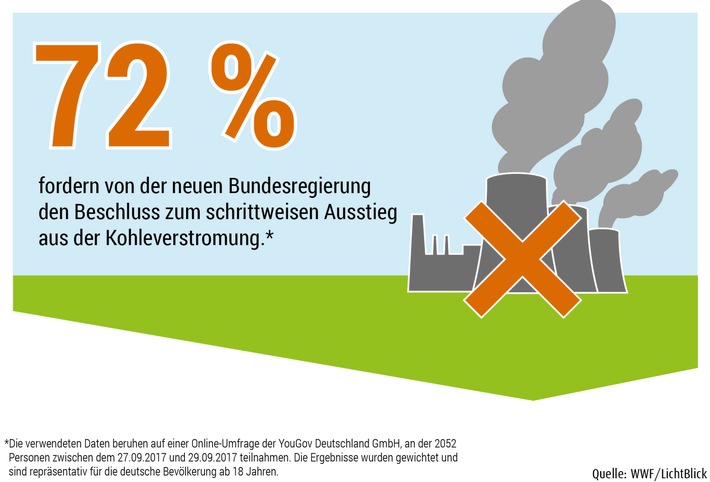 Hamburg (ots) - Fast drei Viertel der Menschen in Deutschland (72 Prozent*) erwarten von der neuen Bundesregierung einen schrittweisen Ausstieg aus der Kohleverstromung. 41 Prozent fordern sogar, dass der Ausstieg möglichst schnell erfolgt. Das hat eine repräsentative Umfrage des Meinungsforschungsinstituts YouGov im Auftrag von WWF und LichtBlick ergeben. Zwischen 27. und 29. September wurden dafür 2052 Personen ab 18 Jahren befragt. "Die Zeit des Aufschiebens ist vorbei: Die neue Regierung hat nicht nur die Wissenschaft im Nacken, sondern auch die eigene Bevölkerung. Denn die Mehrheit hat verstanden, dass Kohle ihre Zukunft und die ihrer Kinder aufs Spiel setzt", so Michael Schäfer, Leiter des Fachbereichs Klimaschutz und Energiepolitik beim WWF Deutschland.