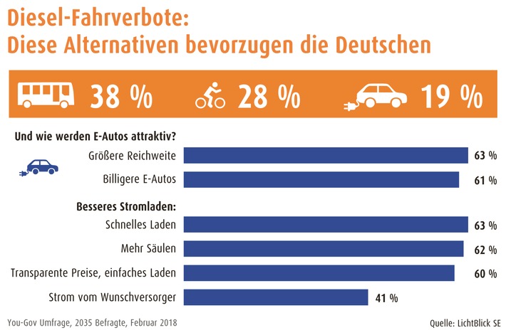 Hamburg (ots) - Eine Mehrheit der Deutschen ist bereit, bei künftigen Diesel-Fahrverboten auf alternative Verkehrsmittel umzusteigen. Beliebteste Alternative sind für zwei Fünftel der Verbraucher (38 Prozent) Bus und Bahn. Mehr als jeder Vierte (28 Prozent) gibt an, er würde das Fahrrad nutzen. Fast jeder Fünfte (19 Prozent) würde ein Elektroauto bevorzugen, sollte es in seiner Stadt zu Fahrverboten kommen. Das geht aus einer YouGov-Umfrage im Auftrag des Ökostromanbieters LichtBlick hervor.
