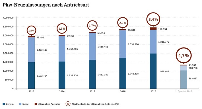 Die Nachfrage nach Pkw mit alternativen Antrieben steigt. Im ersten Quartal 2018 lag der Marktanteil von Fahrzeugen mit Elektro-, Hybrid-, Flüssiggas- oder Erdgasantrieb bei 4,7 Prozent, im Vorjahresquartal waren es 2,8 Prozent. Die Zahl der Neuzulassungen stieg im vergangenen Jahr um 80 Prozent auf insgesamt 118.000 Pkw. Der Monitoringbericht "Alternative Antriebe in Deutschland", den die Deutsche Energie-Agentur (dena) am Donnerstag veröffentlichte, führt die Entwicklung unter anderem auf die größere Auswahl an Modellen, die Diskussion um erhöhte Abgaswerte und Fahrverbote für Diesel-Pkw sowie Fördermaßnahmen wie die Einführung eines Umweltbonus für Elektro- und Hybridfahrzeuge oder die Verlängerung der Energiesteuerermäßigung für Erdgas-Pkw zurück.