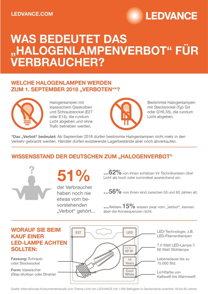 Eine von LEDVANCE beauftragte internationale Konsumentenstudie hat signifikante Wissenslücken zum bevorstehenden "Halogenlampenverbot" zutage gefördert: So ist mehr als jedem zweiten Verbraucher in Deutschland nicht bekannt, dass ab September 2018 unter anderem die weitverbreitete Halogen-"Glühlampe" EU-weit nicht mehr in den Verkehr gebracht werden darf. Ergänzt man die Zahl derer, die davon zwar gehört haben, sich über die Konsequenzen aber im Unklaren sind, erhöht sich die Zahl um weitere 15 Prozent. Besonders prägnant: Viele derjenigen, die vom "Verbot" nichts wissen, schätzen ihr Wissen zur Lichttechnik als hoch ein.