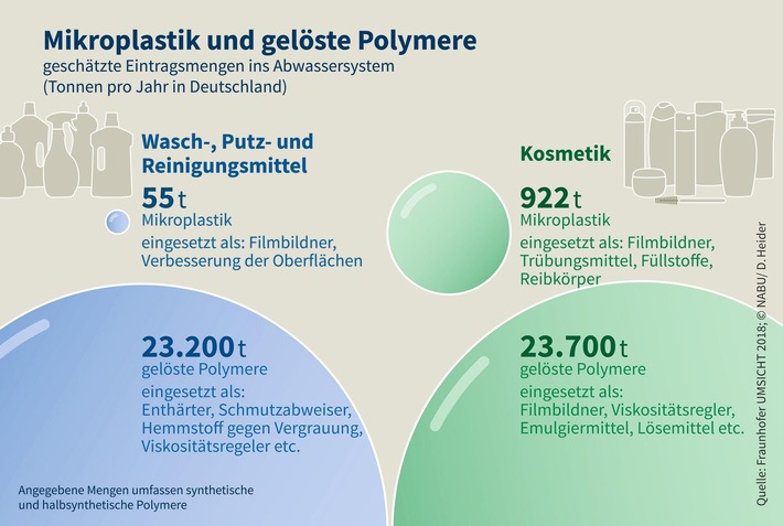 Berlin (ots) - 977 Tonnen Mikroplastik und 46.900 Tonnen gelöste Polymere gelangen jährlich in Deutschland allein aus Kosmetikprodukten sowie Wasch-, Putz- und Reinigungsmitteln (WPR) ins Abwasser. Das sind Ergebnisse einer Studie, die vom Fraunhofer-Institut für Umwelt-, Sicherheits- und Energietechnik UMSICHT im Auftrag des NABU erhoben wurden. Kläranlagen können die Inhaltsstoffe nicht vollständig abfangen, daher gelangt Mikroplastik trotz Abwasserreinigung in unsere Gewässer. Über den Klärschlamm gelangen auch zurückgehaltene synthetische Polymere auf landwirtschaftliche Flächen.