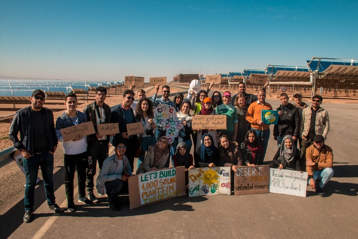 Jugendliche Afrikaner im Solarkraftwerk Noor in Marokko demonstrieren im Rahmen der Initiative "Go for Climate" für grünen Strom aus der Wüste statt weitere Kohlekraftwerke zu bauen. Ein Land mit Wüste kann sauberen Strom zu 2EURCent/KWh produzieren und über Gleichstromleitungen in europäische oder in andere afrikanische Länder liefern, die keine Wüsten haben - der Transportverlust über eine Strecke von 3.000 km beträgt lediglich 10 Prozent. Mit dem Bau von Wüstenkraftwerken unter internationaler Beteiligung und durch den Export der so gewonnenen Energieträger könnte "Energiegeld" schon sehr bald das Entwicklungsgeld ersetzen.